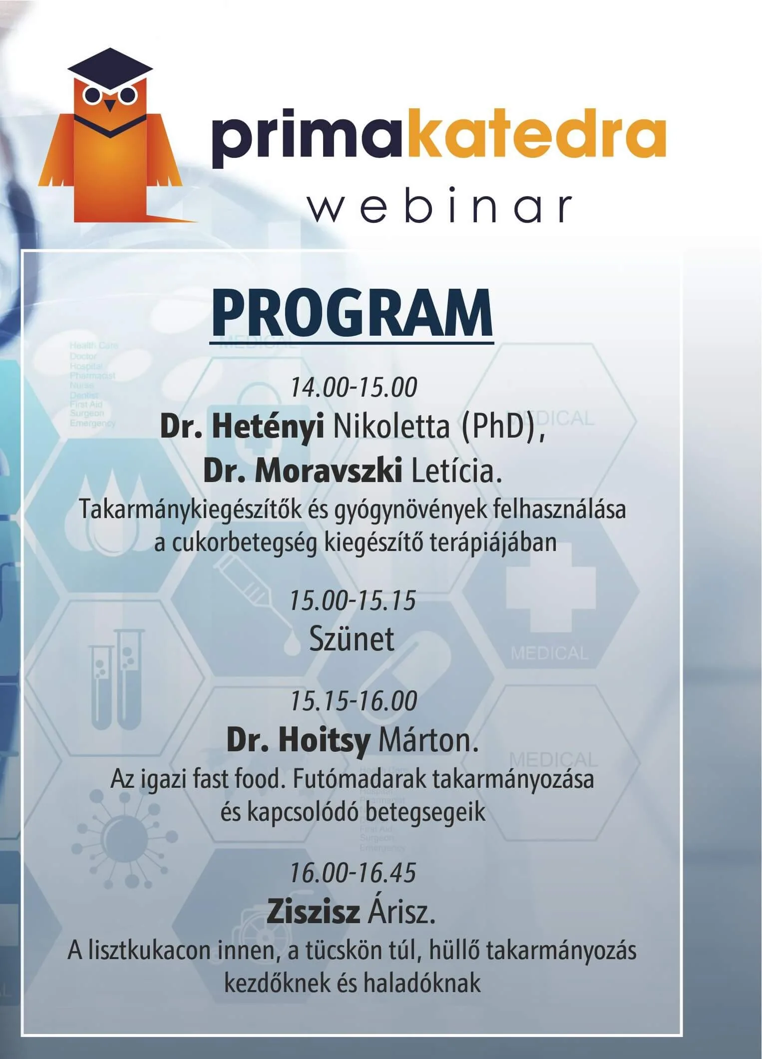 14:00 - 15:00Dr. Hetényi Nikoletta (PhD), Dr. Moravszki LetíciaTakarmánykiegészítők és gyógynövények felhasználása a cukorbetegség kiegészítő terápiájában